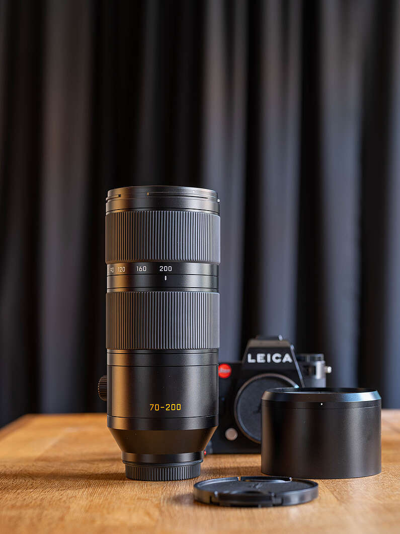 Beim Zoom des LEICA VARIO-ELMARIT-SL 1:2,8 /70-200 handelt es sich nicht wie beim LEICA VARIO-ELMARIT-SL 1:5-6,3 /100-400 um ein Zoom mit variabler Länge. Das LEICA VARIO-ELMARIT-SL 1:2,8 /70-200 bleibt in jeder Brennweite gleich lang. Das hat den Vorteil, dass beim Zoomen kein Vakuum im Objektiv entsteht, in das kleinste Staubpartikel eindringen könnten. Außerdem rutscht das Objektiv beim Tragen am Original-Kameragurt nicht in die Länge, wie es beim Objektiv 100-400 der Fall ist.