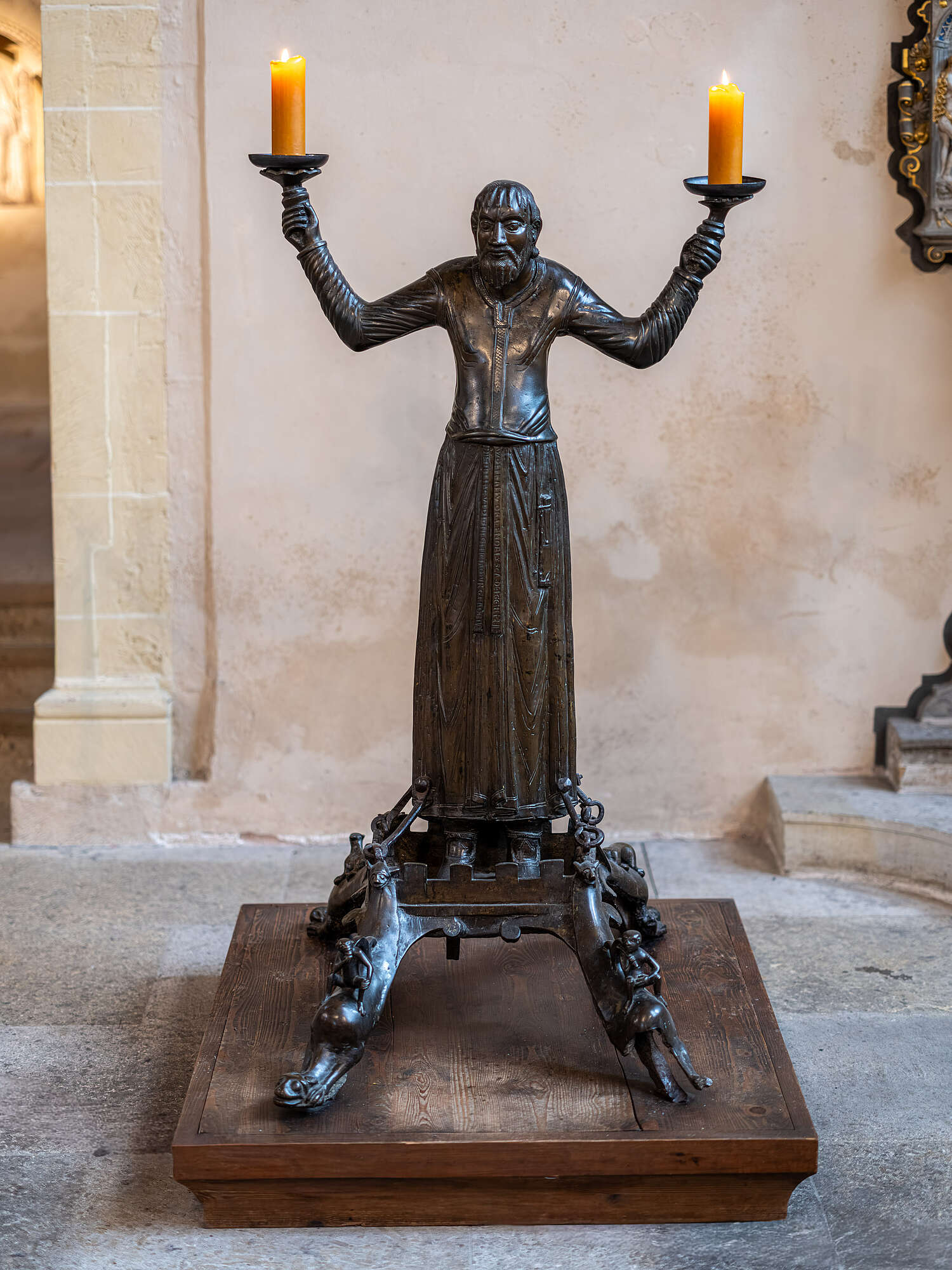 Im Inneren des Erfurter Doms befindet sich eine außergewöhnliche mittelalterliche Bronzeskulptur, die unter dem Namen „Wolfram“ bekannt ist. Die Figur dient als Träger zweier Kerzenleuchter und gehört zu den bedeutendsten erhaltenen Bronzearbeiten des europäischen Mittelalters. Entstanden ist sie vermutlich um das Jahr 1160 in der Magdeburger Gießhütte und zählt heute zu den ältesten freistehenden Bronzeskulpturen Deutschlands. Zugleich gilt sie als die größte nahezu lebensgroße, anthropomorphe Rundplastik aus Bronze aus dieser Zeit.