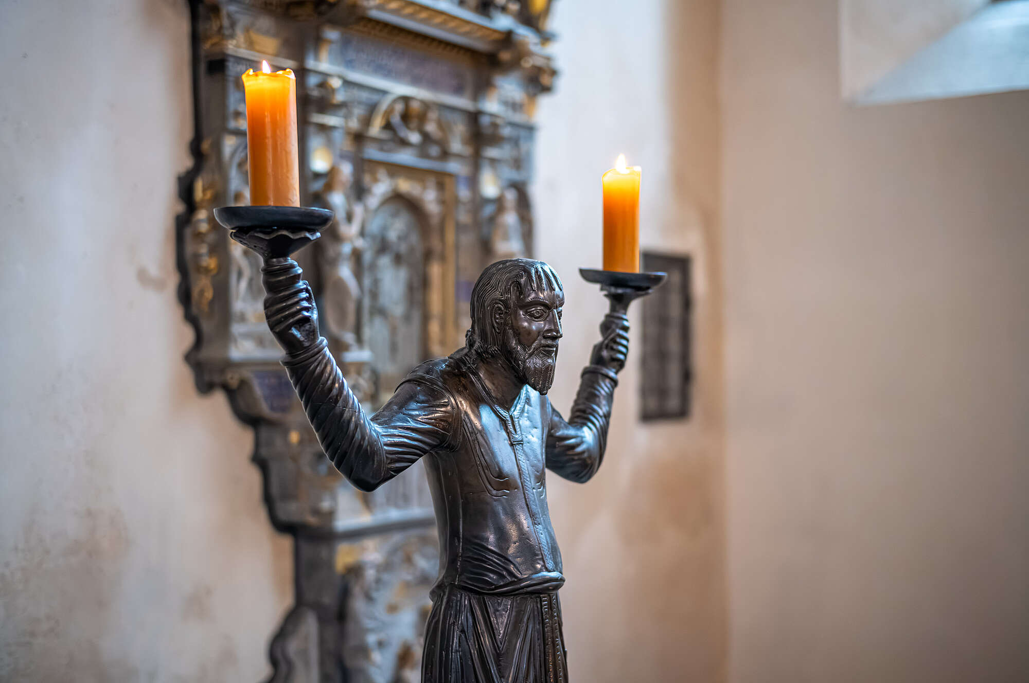 Dargestellt ist ein bärtiger Mann in einem fließenden Gewand, dessen genaue Zuordnung zu Stand oder Epoche nicht eindeutig ist. Die Kleidung lässt sowohl an ein priesterliches Gewand als auch an das Gewand eines Büßers denken. In der Haltung eines Adoranten hebt die Figur beide Arme empor – jedoch ohne die Hände zu öffnen. Stattdessen hält sie zwei Kerzenfassungen, die der Skulptur zugleich ihre praktische Funktion als Leuchterträger verleihen.